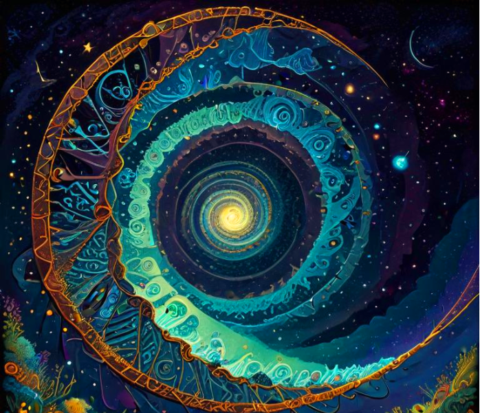 Es la involución y la evolución a escala cósmica. La involución descendente de la mente y la inteligencia forma y guía la creación de las estrellas y sus planetas, y posteriormente la evolución de la humanidad en el arco ascendente de la ascensión de la materia al espíritu.